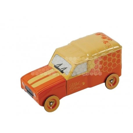 Fourgonnette orange et jaune avec alvéoles en métal pouvant servir de boîte de rangement (boîte à bonbons par exemple).