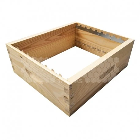 Format Dadant 10 cadres à tenon pour 9 1/2 cadres avec bandes d’écartement.